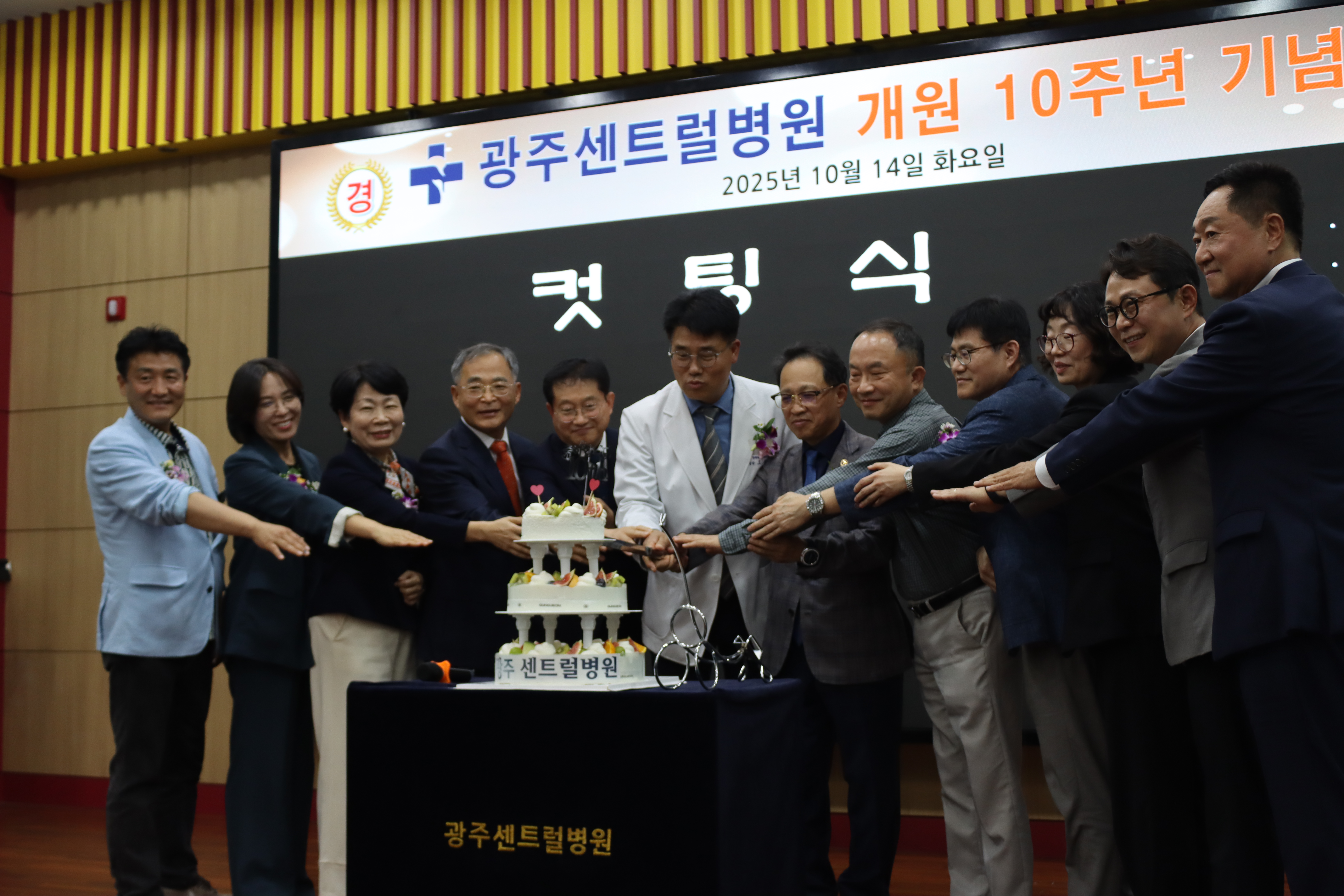 [의학신문·일간보사=차원준 기자] 광주센트럴병원이 14일 오후 5시 병원 재복홀에서 개원 10주년 기념행사를 열고, '준비의 10년, 성장의 10년을 위한 시작' 주제로 새로운 비전을 선포했다. 고길석 대표원장을 비롯해 강기정 광주광역시장, 박병규 광산구청장, 최정섭 광주광역시의사협회장, 이정선 광주광역시교육감 등 내빈과 직원 200여 명이 참석한 가운데, 행사는 국민의례, 병원 약력 소개, 10주년 영상 상영, 축사, 기념사, 장기근속자 포상, 축하공연으로 진행됐다. 강기정 시장은 "광주센트럴병원은 의료에서는 세심한 엄마, 지역사회에서는 든든한 아빠처럼 기여해왔다"며 2년 연속 '대한민국 100대 일자리 으뜸기업' 선정과 달빛어린이병원 운영 등을 높이 평가했다. 박병규 청장은 "'아이부터 어른까지 건강을 책임지는 병원' 목표 아래 헌신에 감사드린다"고, 최정섭 회장은 "전문의와 24시간 소아 응급진료로 높은 평가를 받고 있다"고 축하했다. 고길석 병원장은 기념사에서 "2015년 수완아동병원으로 시작해 2023년 종합병원 승격으로 '광주센트럴병원'이 됐다"며 대학병원급 의료진과 첨단 장비를 통한 통합 진료 체계 구축, 호스피스·간호통합서비스 확대, 건강검진센터 강화 등을 회고했다. 그는 "심뇌혈관센터 확대를 통해 광주 최고의 2차 병원으로 지역 의료를 선도하겠다"고 포부를 밝혔다. 행사에서는 발전에 기여한 장기근속자 15명에게 공로상이 수여됐으며, 의료진 소개와 축하공연으로 분위기를 고조시켰다. 지난 10년간 정형외과·내과·신경외과 등 다양한 진료과와 응급·재활·호스피스 서비스로 지역 주민들의 신뢰를 쌓아온 광주센트럴병원은, 앞으로도 사회공헌과 첨단 의료로 '믿고 찾는 병원'으로 도약할 계획이다. 병원 관계자는 "지역과 함께하는 따뜻한 미래 의료를 실현하겠다"고 밝혔다. 출처 : 의학신문(http://www.bosa.co.kr) |
